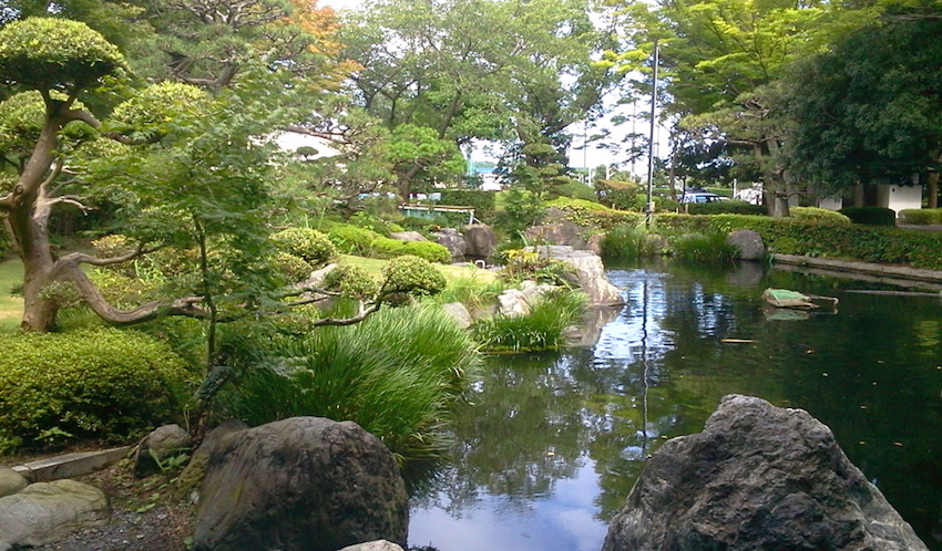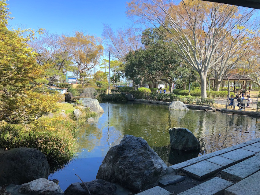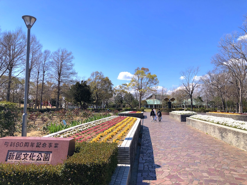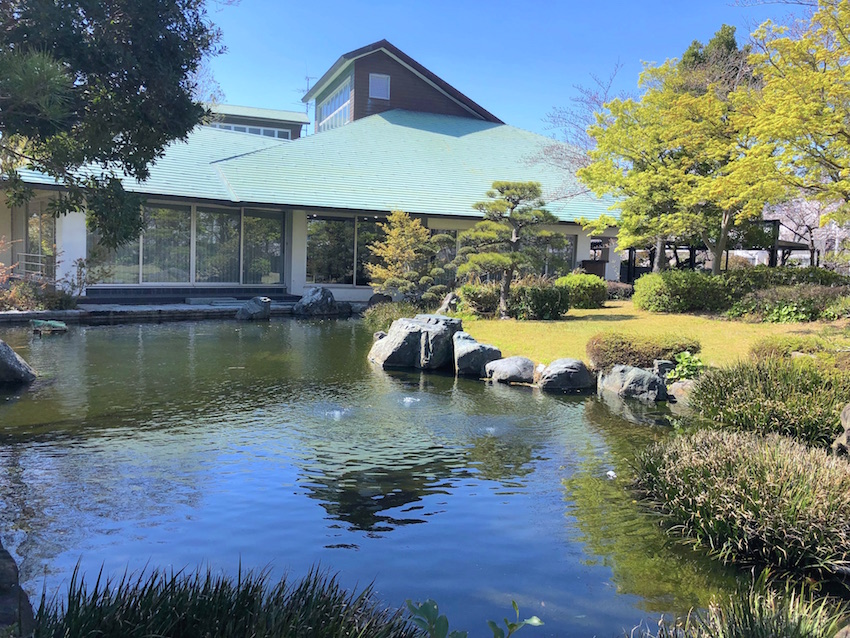 世界的に有名な『足立美術館庭園』をはじめ、海外でも日本庭園を手掛けた現代を代表する造園家・中根金作の造った庭園がこの新居町には複数あるとされます。『新居文化公園』は町制90周年記念事業で昭和後期に完成した新居町の都市公園で、公園及び園内にある図書館の日本庭園の設計・作庭が中根金作(中根庭園研究所)が手掛けたものです。図書館の池泉回遊式庭園は建物の外周にあるものなので自由に見学が可能。