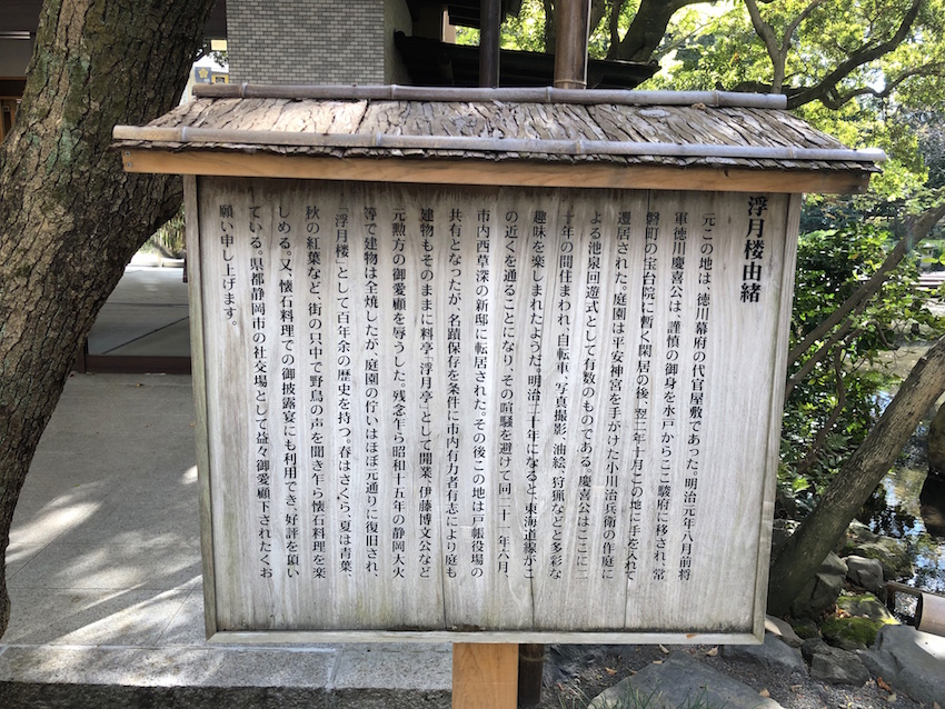 「浮月楼」(ふげつろう)はJR静岡駅のほぼ駅前にある料亭・結婚式場で、江戸幕府第15代目将軍・徳川慶喜が大政奉還の後に暮らしていた屋敷のあった場所。また現在も一部残る池泉回遊式庭園は小川治兵衛による作庭。