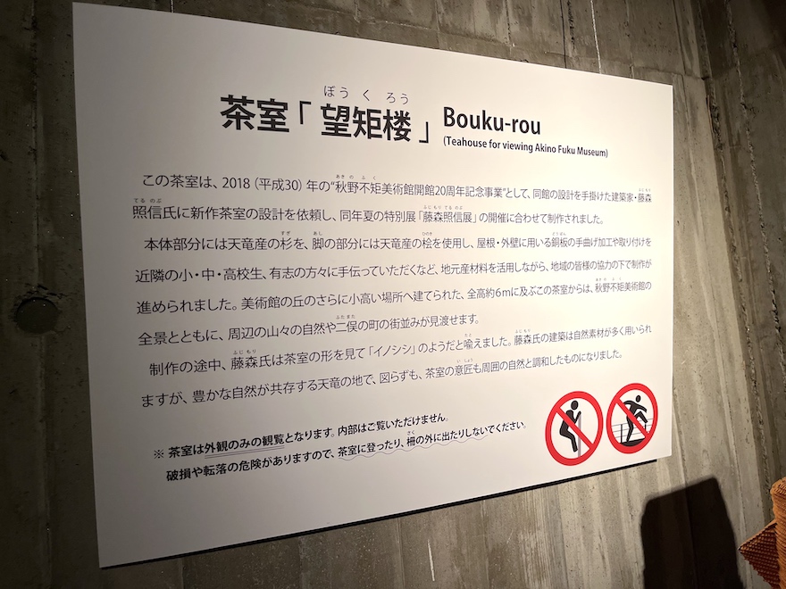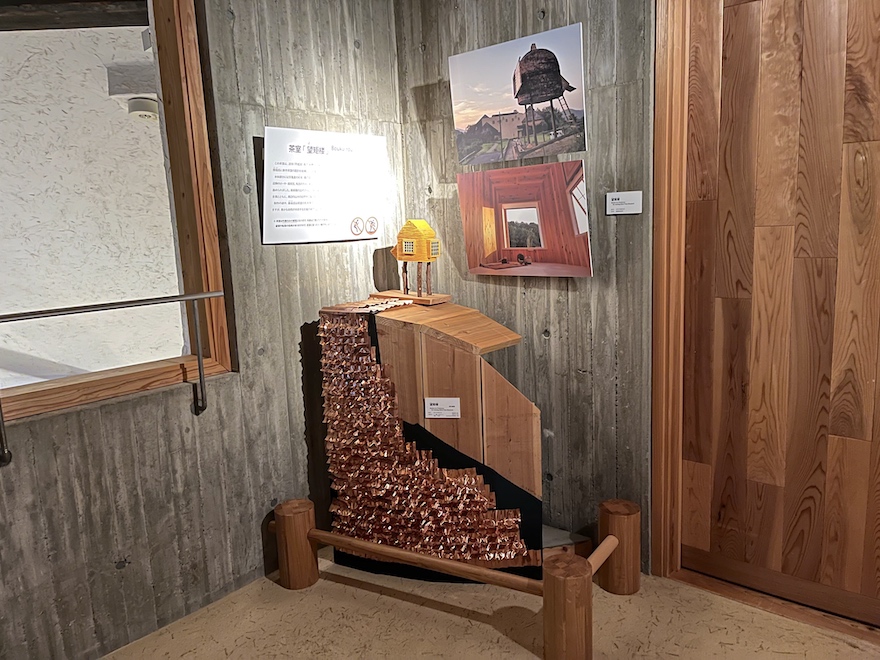 そんな秋野不矩美術館の開館20周年を記念して2018年に完成した茶室“望矩楼”(ぼうくろう)。『藤森照信展』の開催に合わせて建築されたこの新作茶室は「高過庵」「茶室 徹」などに続くツリーハウス風茶室で、地元の木材(天竜杉・檜)を用いているだけでなく、外壁に使われている銅板は地元の小中高生が加工や取り付けにも協力。