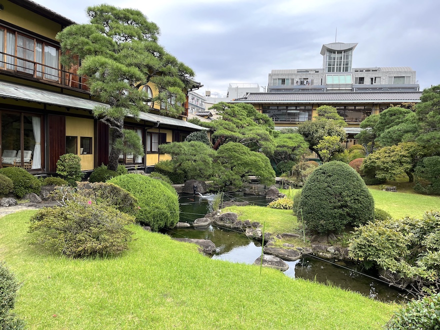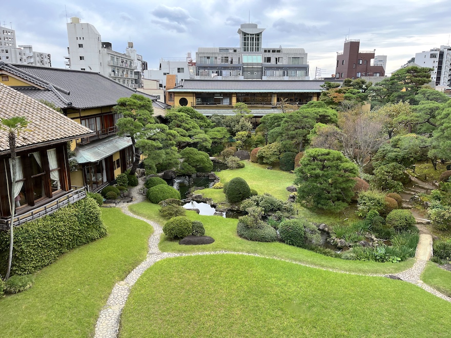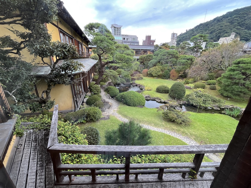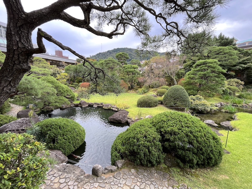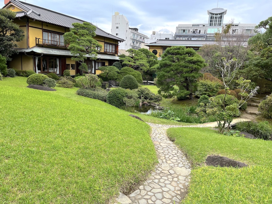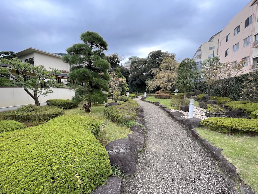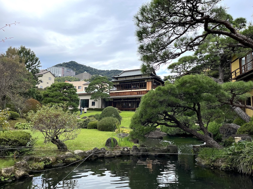 庭園の各所からは周囲の山々とマッチした景観も楽しめる。…もしかしたら根津別荘当時の和館の2階からは(正面に見える旧大浴場やビル・マンションもなく)熱海の海も眺められたのかもなぁ。