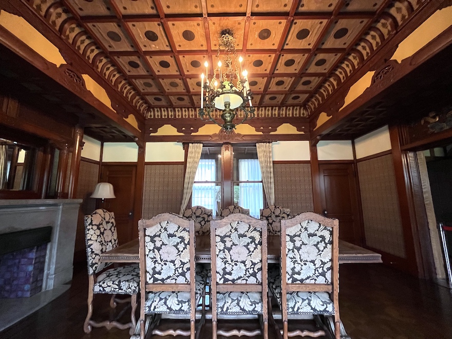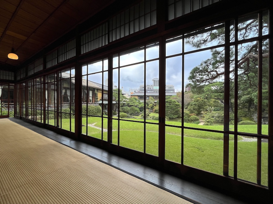 受付を済ませてまず鑑賞するのが庭園を見下ろす和室「麒麟」(1階)と「大鳳」(2階)。大正時代の一番最初に建てられたのがこの部屋。後の洋館と比べると地味かもしれないけど、一面の大正ガラスや床の間の意匠、2階の格子状の壁面など“近代和風建築”としての斬新な見所がいくつも。