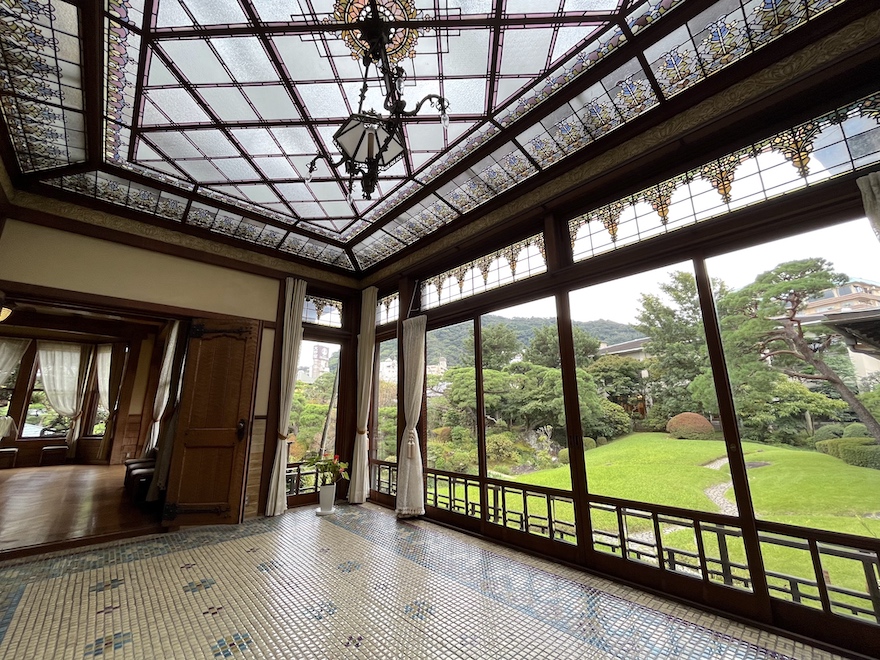 数寄屋風の渡り廊下を経て、ここから根津嘉一郎が増築した和洋折衷の近代建築ゾーンに。まず洋館「玉姫」と「玉渓」。玉姫はサンルームのステンドグラスの天井、そしてカラフルなタイル敷が圧巻。この洋空間と和風庭園の組み合わせ…!