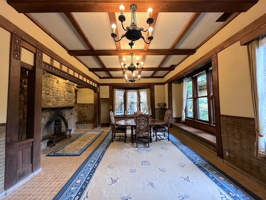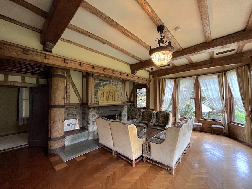 ここから旅館時代の客室(現在は文豪関連の展示室)を挟んで、再び根津別邸時代の洋館「金剛」へ。こちらは「玉渓」と雰囲気に似たヨーロッパの山荘風の建築。ここでも豪華な暖炉。