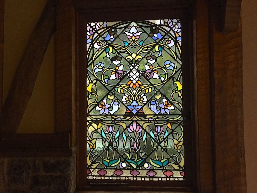 一見“洋館”のようなのだけど、玉姫の主室は折上格天井(和風)あり、家具や暖炉はヨーロッパ風…と和洋折衷。隣り合う玉渓も洋風の山荘が基調だけれど、どこか和の感じがする。ここにも素敵なステンドグラスが。