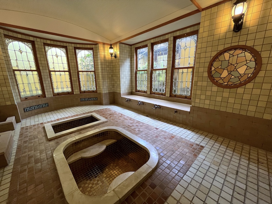 それと隣接するのがやはりここでもステンドグラスが素敵…な「ローマ風浴室」。その唯一無二のデザインの浴室は映画のロケ地にもなったとか。あと写真は載せてないけど、旅館「起雲閣」時代の浴槽もこれまた深い浴槽がレトロで良い。