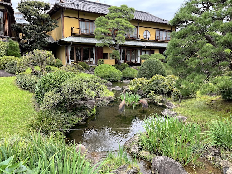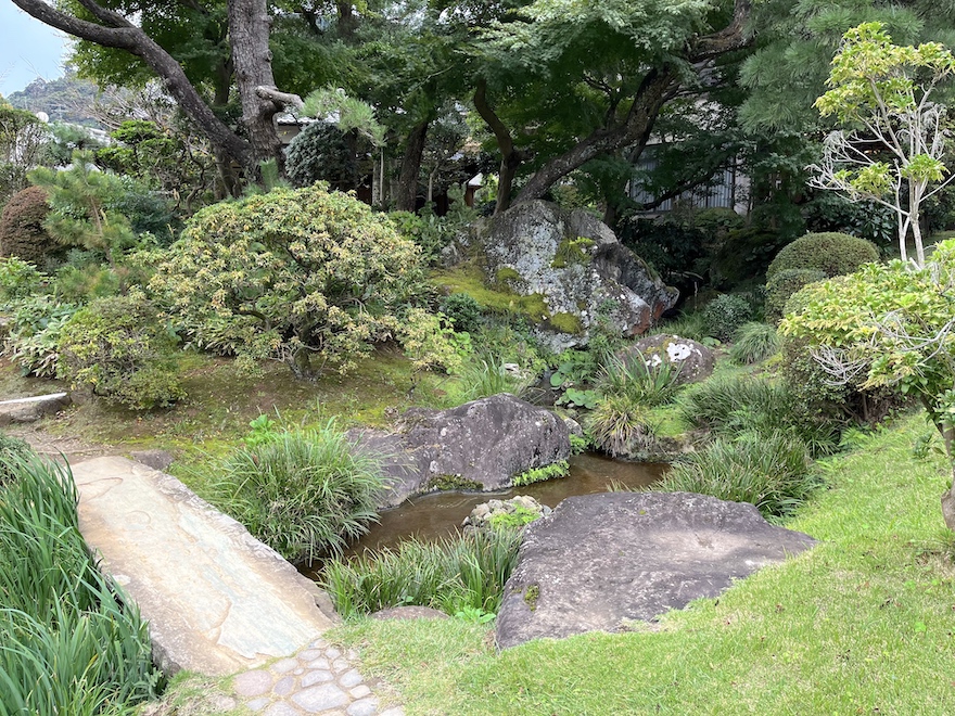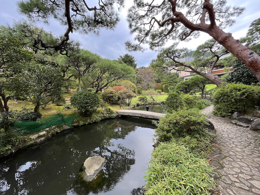 そして起雲閣の庭園は前述の通り根津嘉一郎の別邸時代、大正末期〜昭和初期に作庭されました。熱海の緩やかな斜面の地形を生かした約1,000坪の池泉回遊式庭園で、主屋(和館・洋館)の手前には芝生と園路が広がり、中央部を川が流れ、その水はやがて池泉へと流れ込みます。