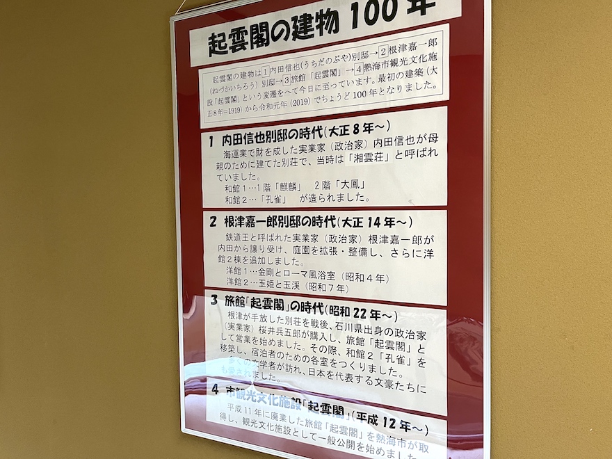 「起雲閣」(きうんかく)は観光地・熱海の市街地にある大正時代の近代別荘建築。かつて“海運王”内田信也や東京の『根津美術館』が有名な“鉄道王”根津嘉一郎の別邸として築かれ、和洋豪華なお屋敷と庭園を鑑賞することができます。熱海市指定有形文化財。