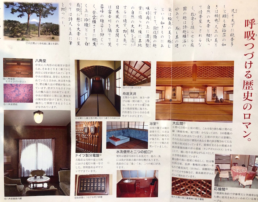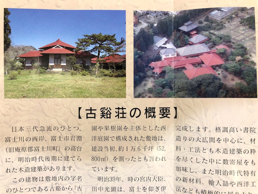 宮内大臣だった明治後期に東海道の宿場町「吉原宿」「蒲原宿」の間宿であった「岩淵宿」のあったエリア、富士川と富士山をのぞむ高台にこの大邸宅は作られました。後に清水区蒲原の「青山荘」(こちらも建物は現存しています。)へ移るまでこの地で隠居生活を送られたそう。その後「講談社」の創業者である野間清治の所有となり、現在は野間文化財団が管理・所有しています(「野間農園」が隣接)。
