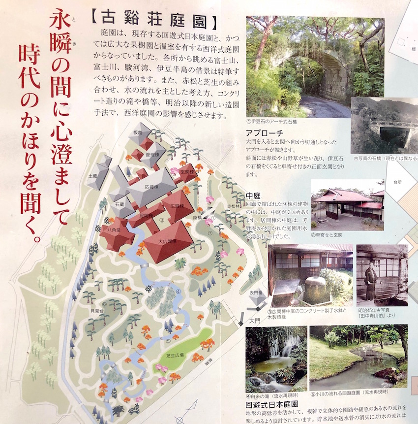 その庭園の池泉の為の貯水池や水源としてこの古谿荘の500m〜1km程離れた場所に『一葉庵』(赤岩離邸)、『芳野庵』(吉津離邸)といった施設があったそう(現在は特に遺構はないそう)。今回は富士市の工事の都合で「流水」は再現されなかったのですが、また水が流れている時の様子も見てみたい…。