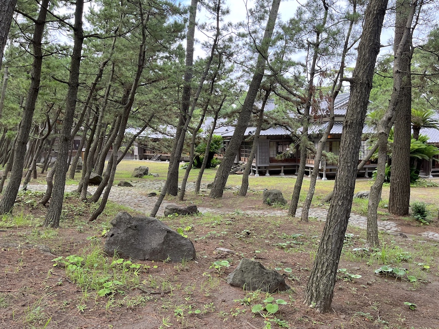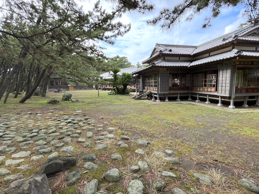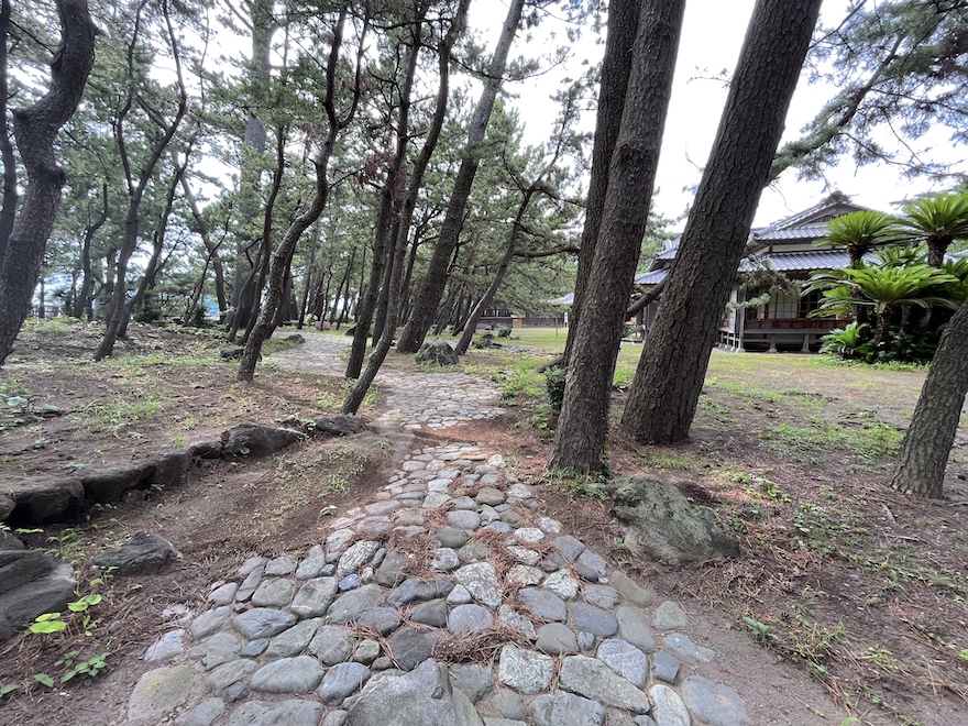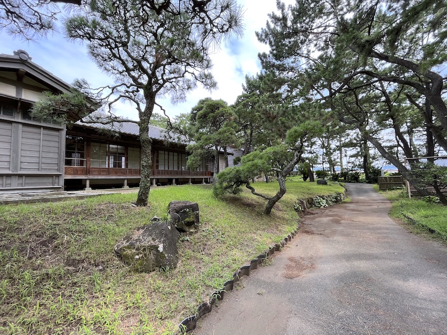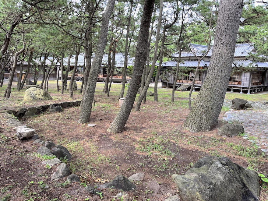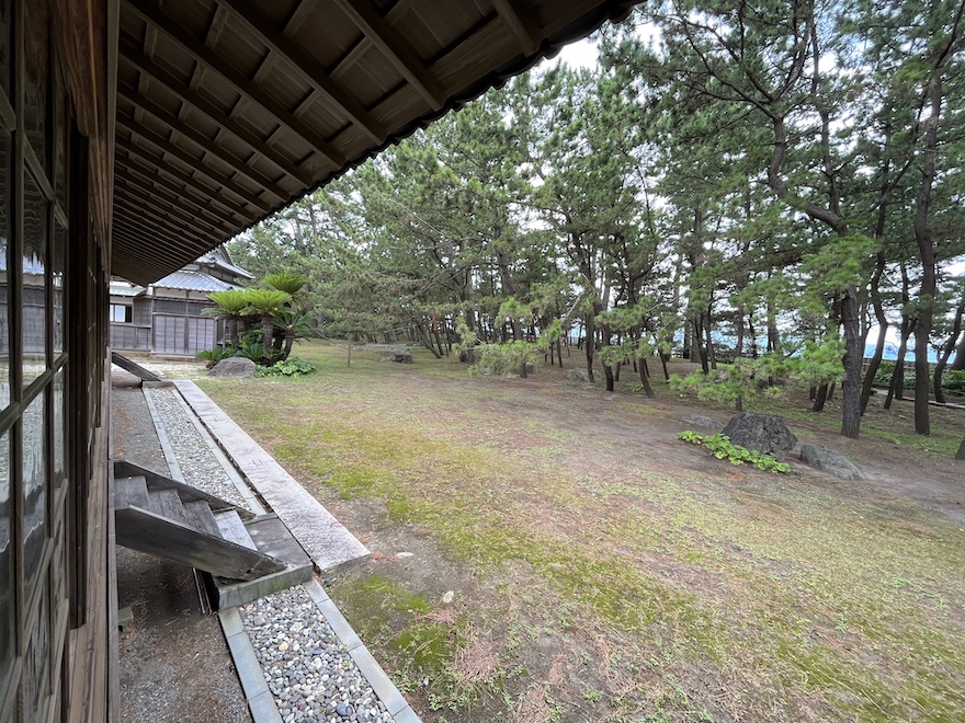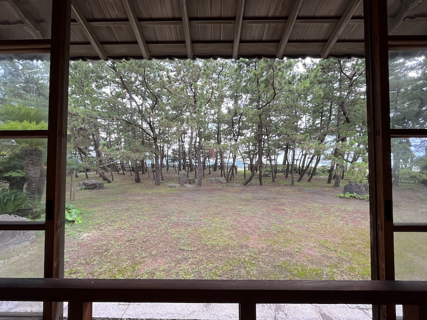西附属邸から駿河湾へ向けて庭園が広がります。ザ・日本庭園というよりは比較的シンプルな庭園で…海の中の島々を表現するかのような庭石が配されてはいるけれど、それらの主張も強くなく(唯一、温暖さを感じさせるソテツだけ主張が強め)、松林の景観を最大限に活かつつ、松林越しに駿河湾〜対岸の山々をのぞむ眺望が重要視された庭園。 公式サイトの昭和年代の写真で見ると建物の前はも少し芝生の広場って感じだったのかな。