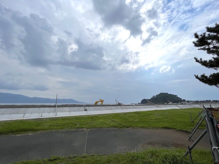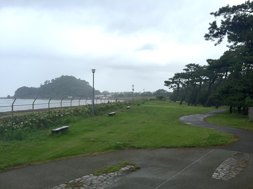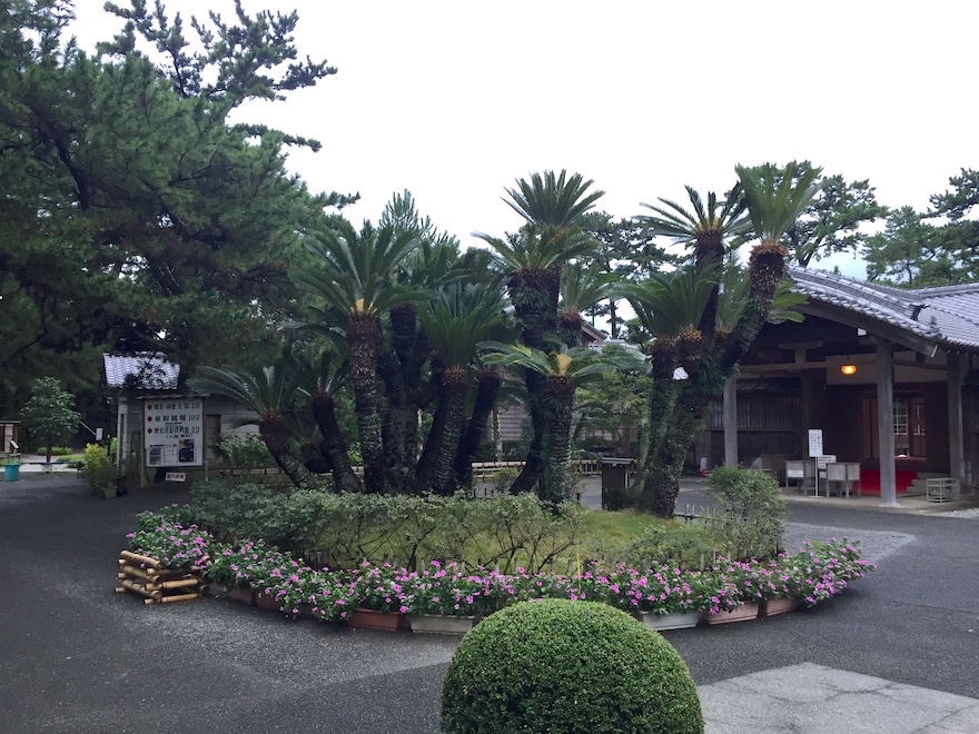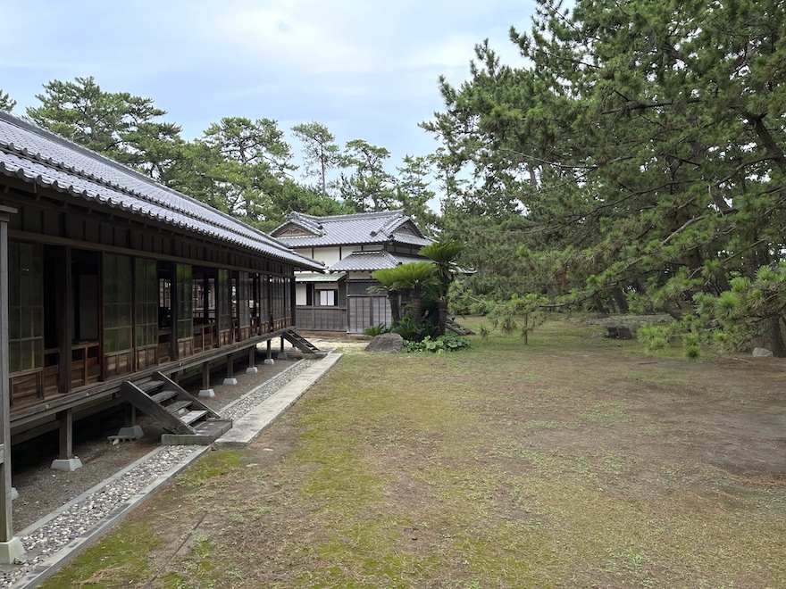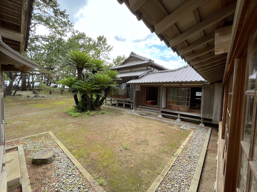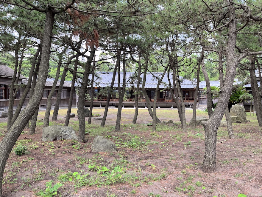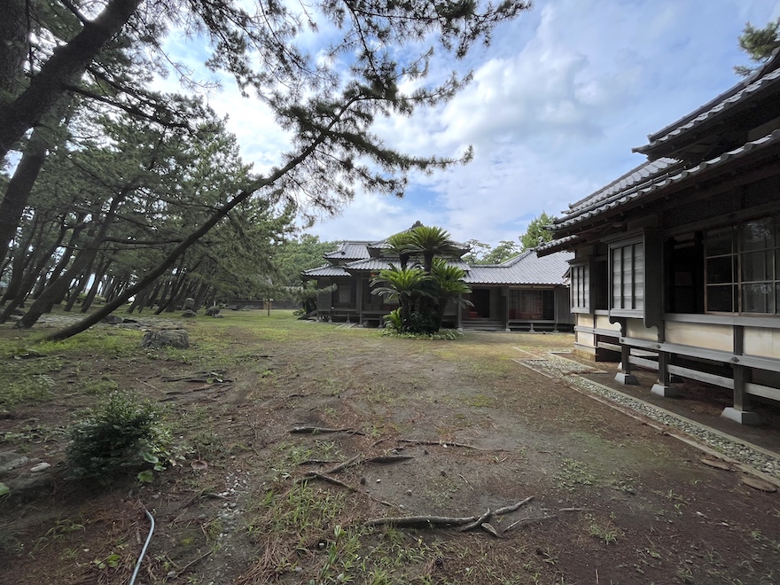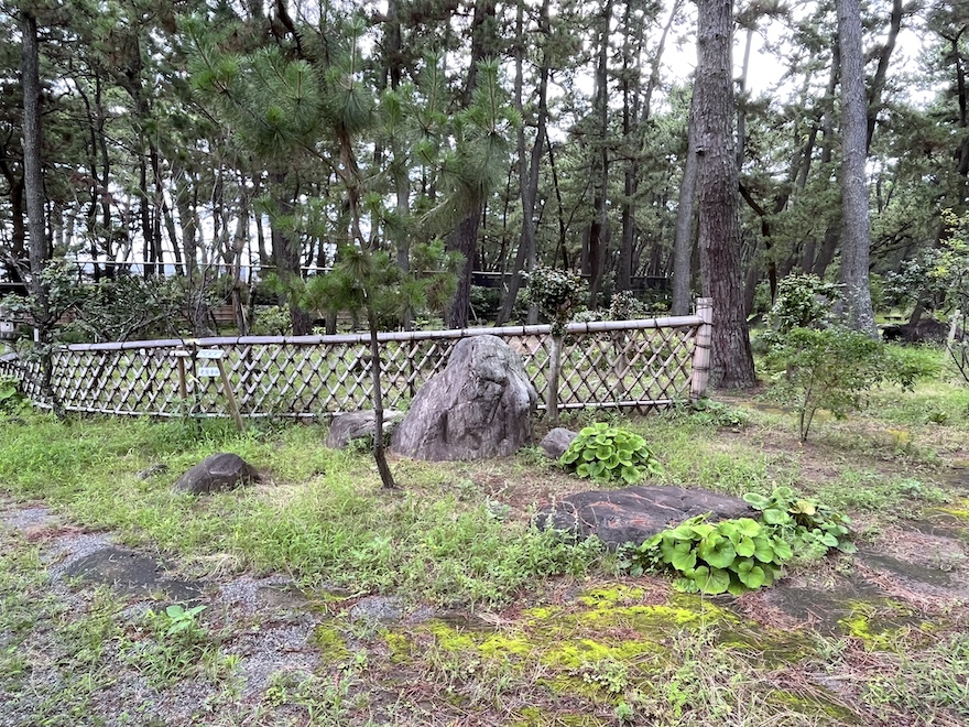 西附属邸から駿河湾へ向けて庭園が広がります。ザ・日本庭園というよりは比較的シンプルな庭園で…海の中の島々を表現するかのような庭石が配されてはいるけれど、それらの主張も強くなく(唯一、温暖さを感じさせるソテツだけ主張が強め)、松林の景観を最大限に活かつつ、松林越しに駿河湾〜対岸の山々をのぞむ眺望が重要視された庭園。 公式サイトの昭和年代の写真で見ると建物の前はも少し芝生の広場って感じだったのかな。