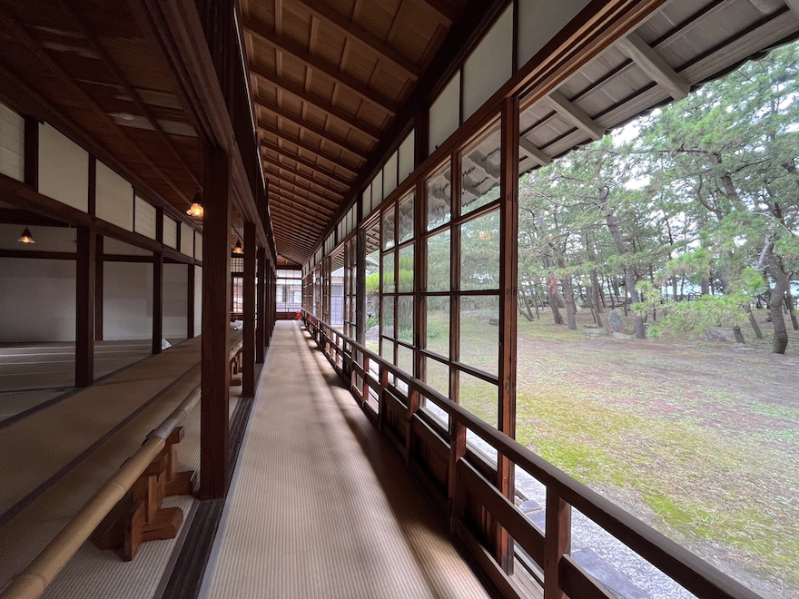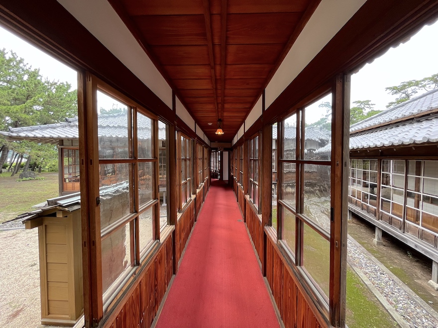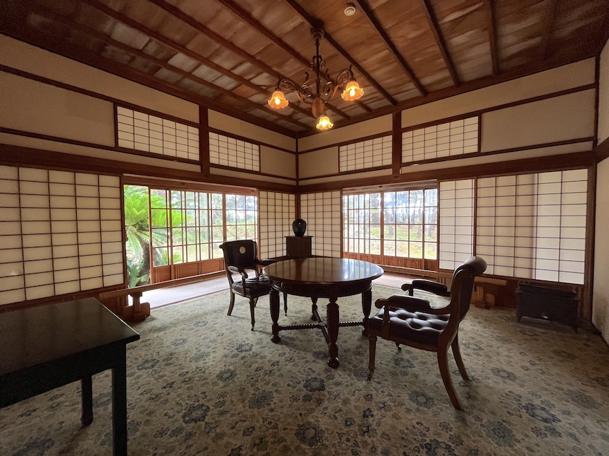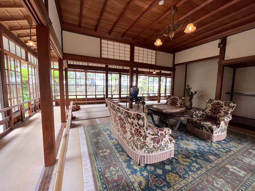その部屋数は26、平屋建ての建築の広さは1,270平方メートル。庭園みたいな広さの単位。全体的には純和風建築で、近代和風建築によくある数寄屋風の凝った意匠…とかはほぼ見られないのですが、シャンデリアなど洋風のインテリアで飾られた“謁見所”、庭園に面しソファーの置かれた“御座所”等からはその格式の高さが伝わってくる!