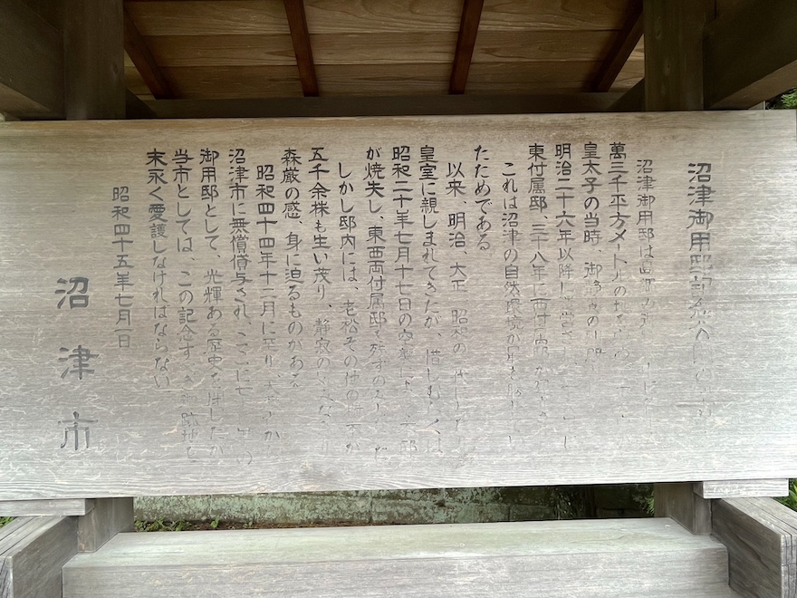 その歴史について。1893年(明治26年)に当時皇太子だった大正天皇のご静養のために造営が開始。駿河湾に面し富士山も望むこの地は景色も良く気候も温暖で、先に西郷従道/大山巌/川村純義といった陸海軍の大臣の別荘が建てられていたそう。川村純義は後に昭和天皇の養育係もつとめました。
