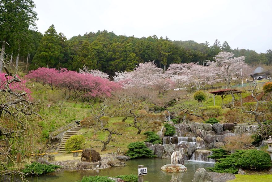 その目玉的な存在が“しだれ梅”。園内の中心部にある池泉回遊式流水庭園の周囲に約80本の枝垂れ梅が植栽され、2月下旬〜3月上旬に白〜ピンク色の花で彩られます。それに続き3月下旬〜4月上旬には300本のソメイヨシノをはじめとする桜や花桃、それ以降もツツジ・サツキ・1万株のアジサイ・ササユリなど季節の花々が園内を彩ります。