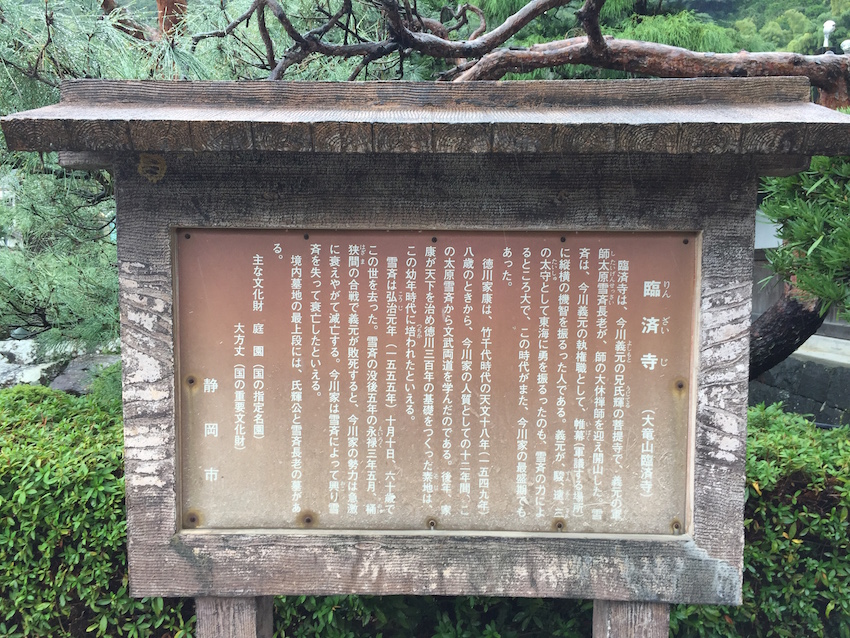 「臨済寺」(りんざいじ)は戦国大名・今川家ゆかりの寺院(菩提寺)で、本堂が国指定重要文化財、安土桃山時代に築庭されたという池泉鑑賞式庭園が国指定名勝となっています。