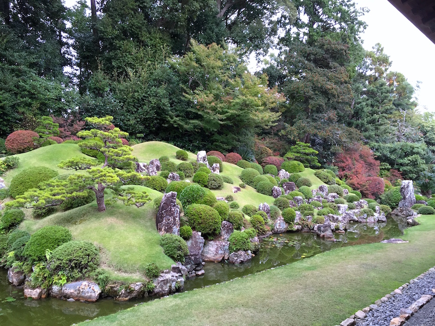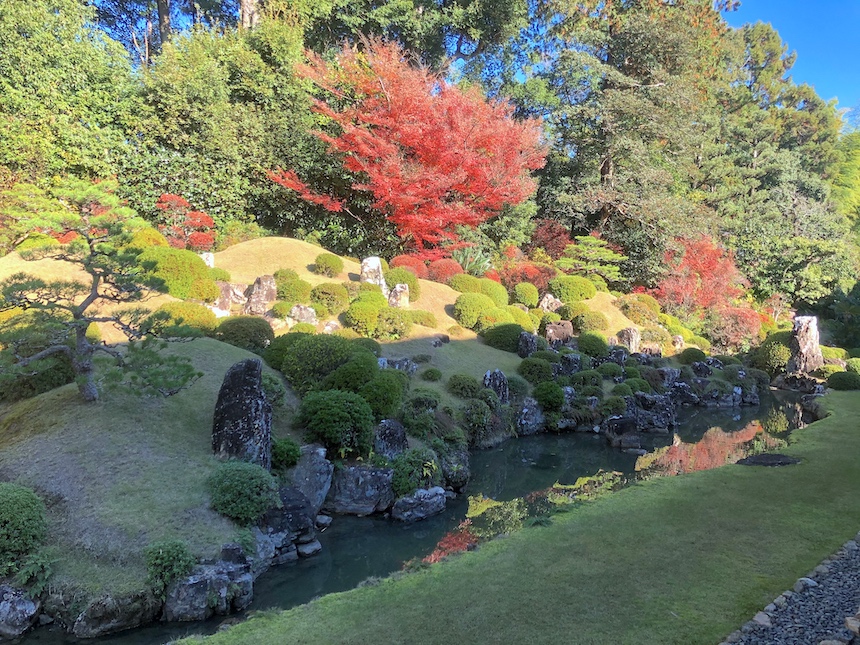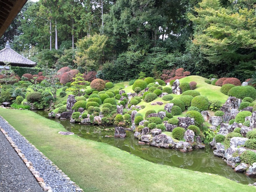 視点場(ビューポイント)は二つあり、まずは本堂から庭園を向かい合って見たとき。もう一つが、庭園の上手側にある書院からの眺め。