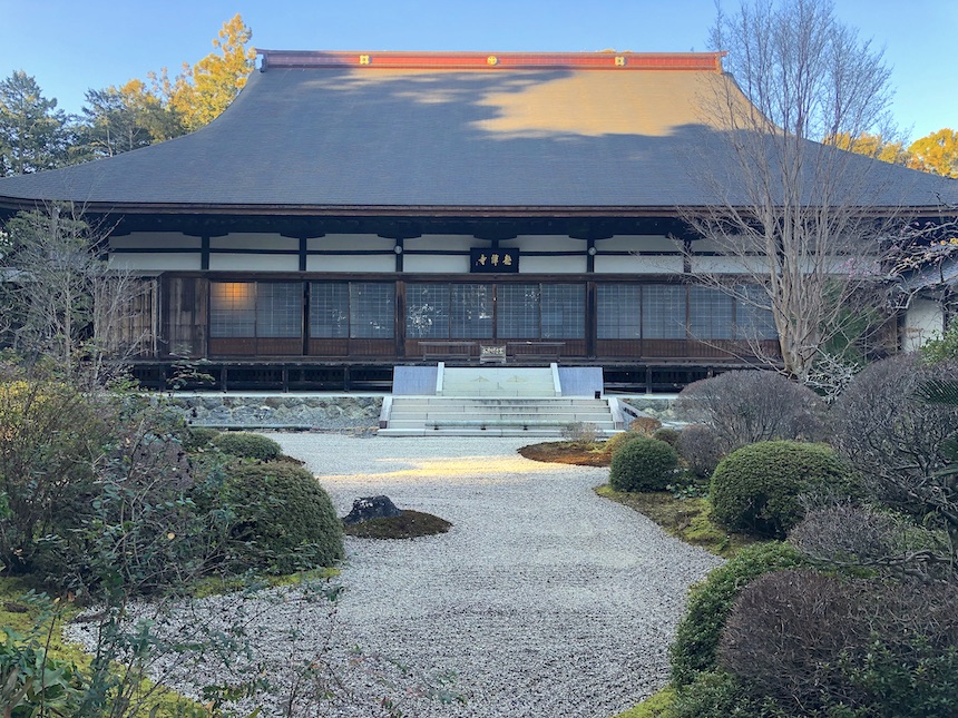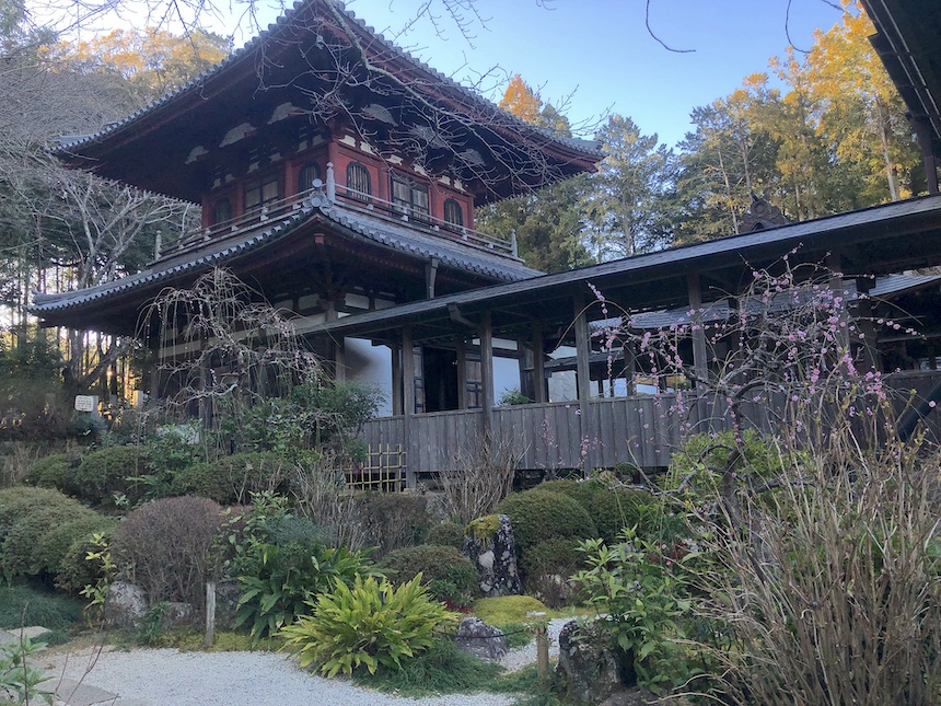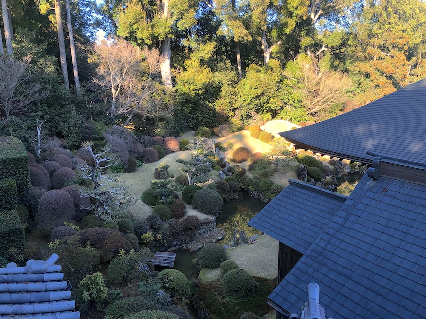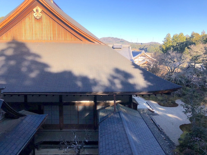2月には特別に1702年に建造された朱色の楼閣建築・昭堂大悲閣(開山堂)の2階にも上がらせていただきました…!左手には遠州の庭園、そして右手には大きな本堂の屋根に枯山水。遠目にのぞむ引佐の山々の風景も美しい。