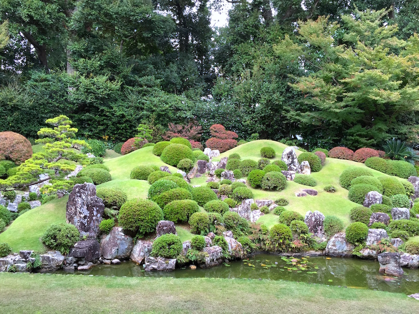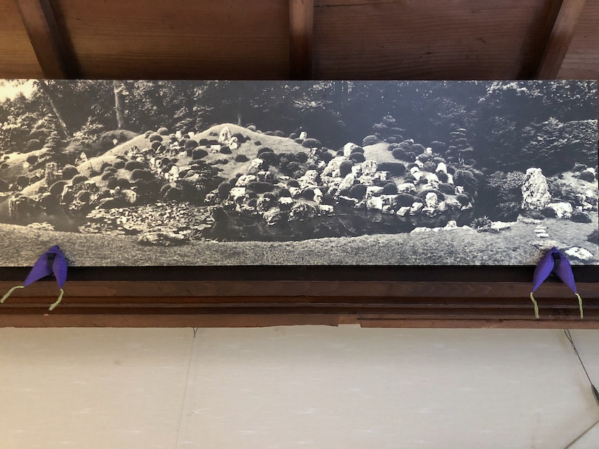 名勝庭園の頭上の樹木は昔は低く、近現代以降の周囲の開発などもあり現在はこのように育ったのだとか。借景も美しかったのかもなぁ。(本堂に飾られていた昭和中頃の修復時?の白黒写真の時点ではもう樹木が茂っているけど、ツツジやサツキの玉が小さい事はわかる)
