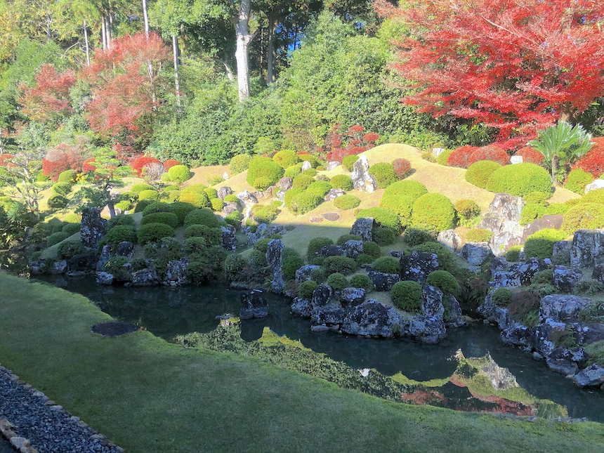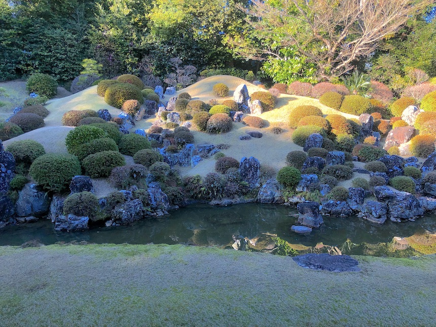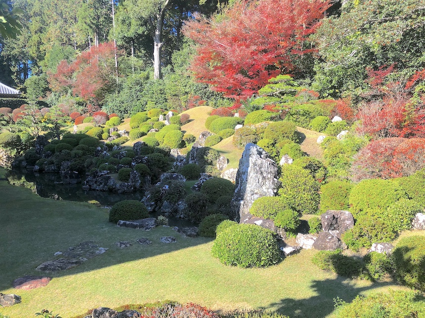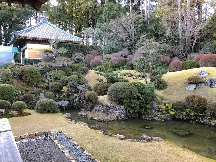 そして本堂の北側にある池泉鑑賞式庭園が小堀遠州の作庭と伝わる国指定名勝の庭園で、寺伝によると1630年頃の築庭。横に長い池泉は心字池になっていて、築山には数多くのサツキ、ツツジ、そして地元のチャート石が多く用いられた石組で滝石組が表現されています。