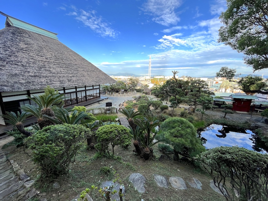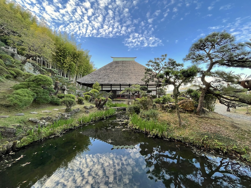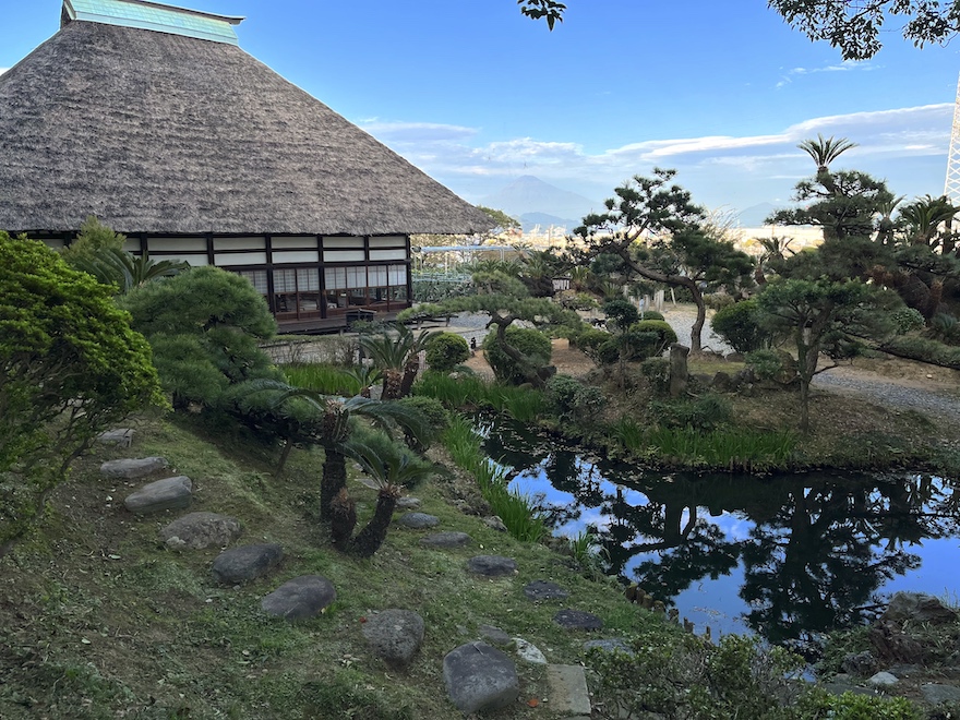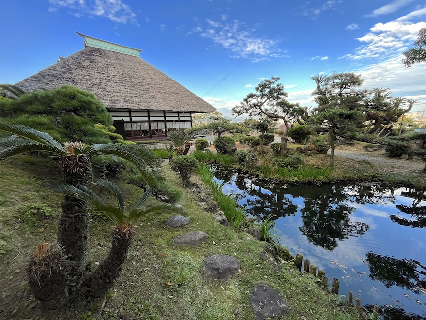 庭園“観富園”はその名の通り“富士を観る庭園”。日近の構想の下で池泉を駿河湾に、そして本堂の茅葺屋根を富士山に見立てて造園に約10年を費やしたという池泉回遊式庭園で、庭園奥からは庭園・本堂越しに富士山をのぞむという絶景が見られます。