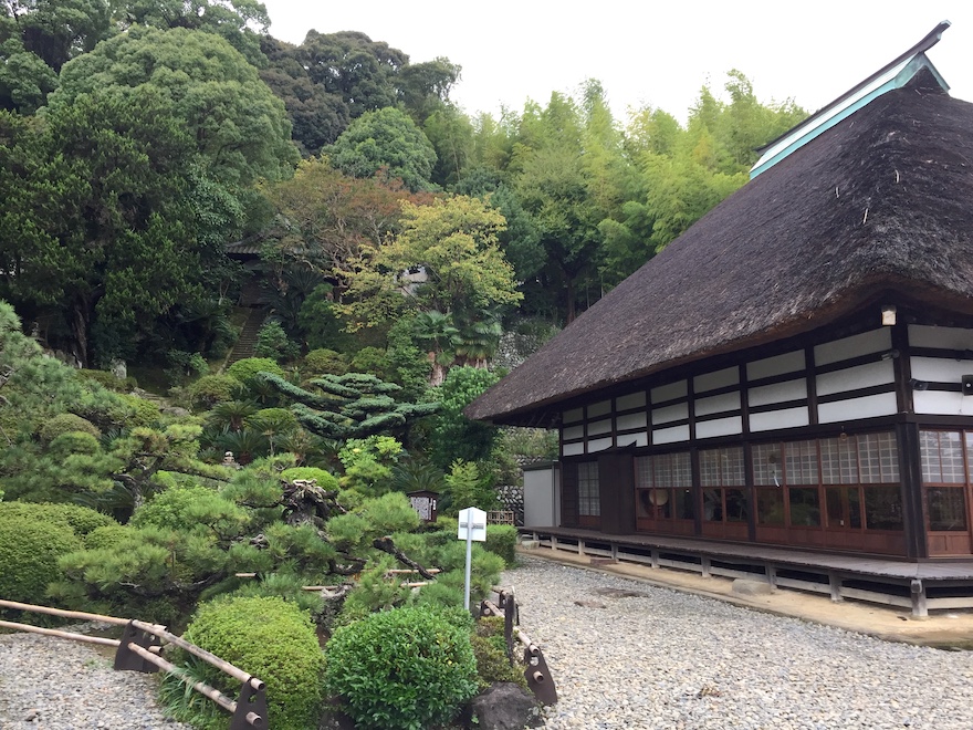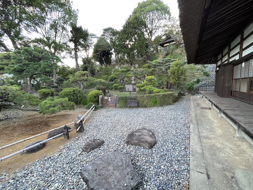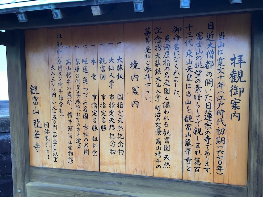 緩やかな坂を登った先にある本堂のような立派な祖師堂、そして龍華寺に眠る明治の文豪・高山樗牛の遺品や作品を展示する「樗牛館」は平成年代(2003年)の建立と新しいですが、茅葺屋根の本堂とその先にある庭園“観富園”は江戸時代初期の創建時に徳川家(徳川頼宣と徳川頼房)に寄進/造営されたもの。なお御本尊の釈尊坐像も紀伊徳川家からの寄進。