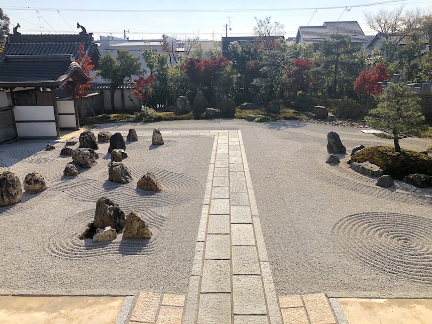 まずは本堂前庭の枯山水庭園“無量寿庭”。本堂から見て正面に三尊石、右手に亀島、そして左手には27mの龍を抽象的に表現した石組。