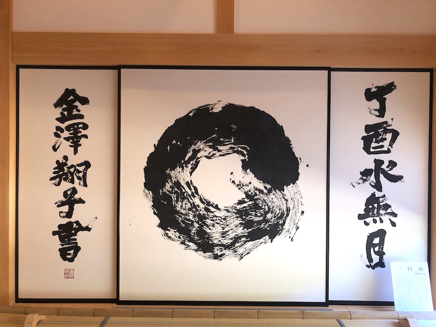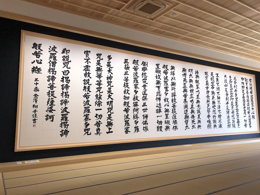 その庭園から、近年建立された涅槃堂へと進むと『地獄極楽図』という十六の絵図が展示された回廊と、そして書家・金澤翔子さんによる『世界一大きい般若心経』があります。有名になる以前より金澤翔子さんと縁深いお寺さんだそうで、この作品以外にも複数の奉納された作品を鑑賞することができます。御朱印も金澤翔子さんデザインのものがあるとのこと。(※また通常公開はされていませんが、白隠禅師の書画や伊藤若冲横山大観、狩野派絵師による絵画も所蔵しているそう。)