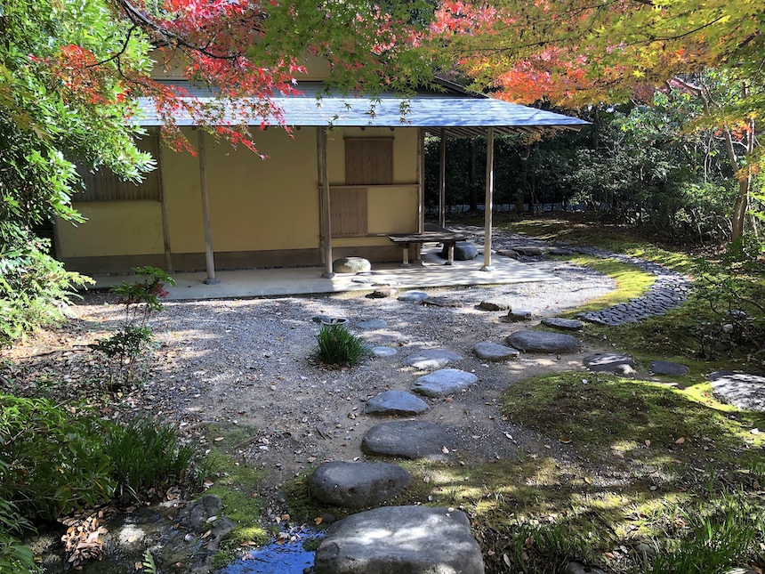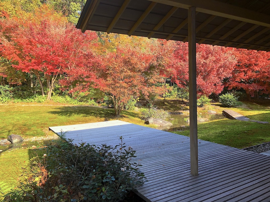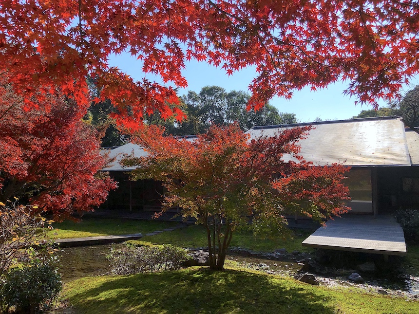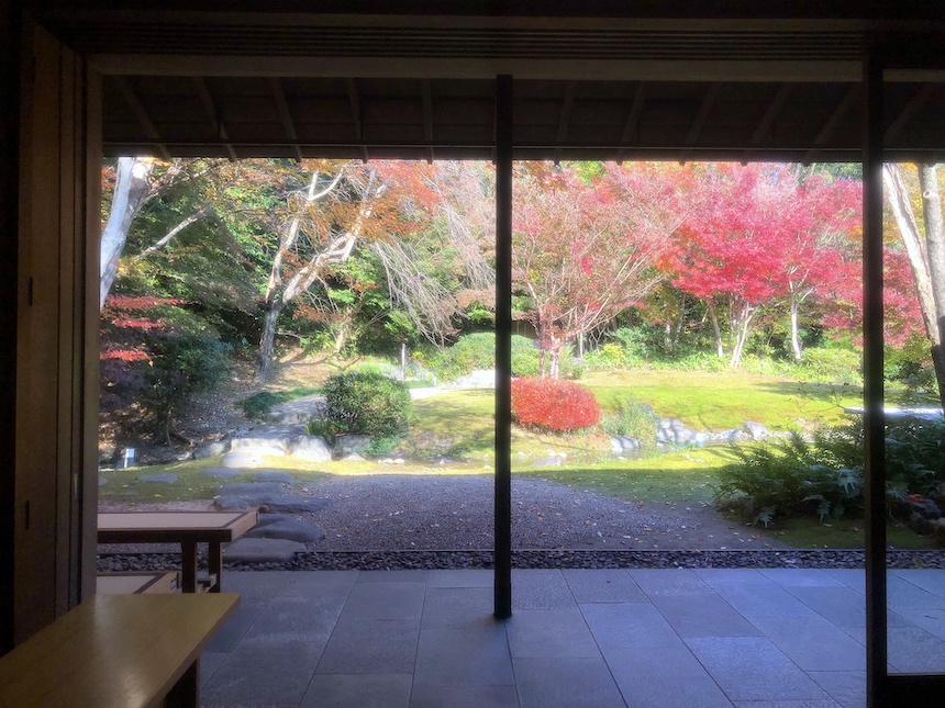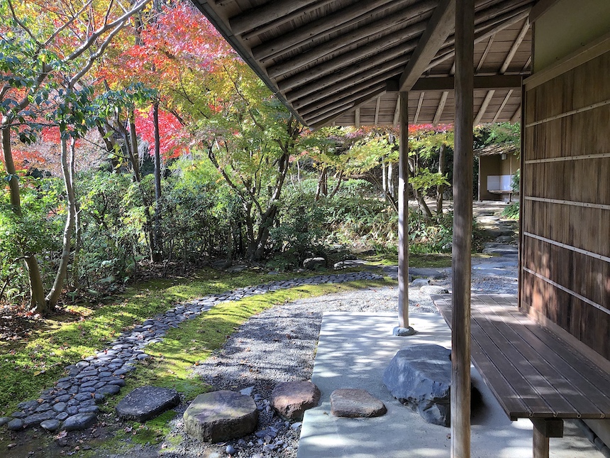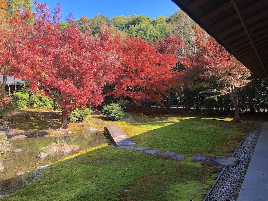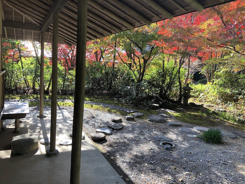 そして今回訪れたのは4回目、初めて訪れてから約8年。最初は芝生のお庭だったけど、今では苔の広がるお庭になっている(今回は紅葉もピーク!)。庭園は立礼席での呈茶(400円)ののち回遊することができます。