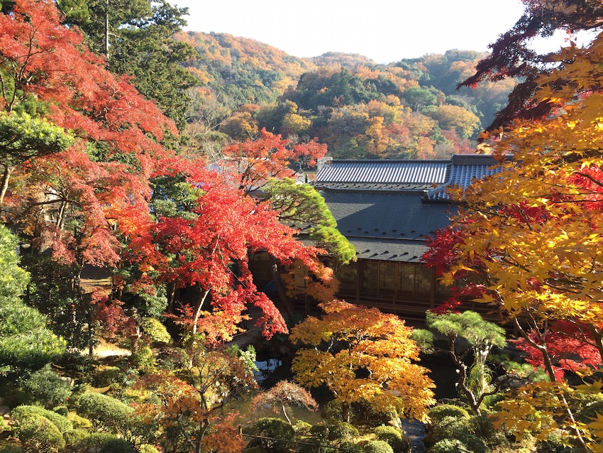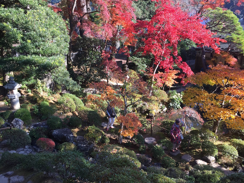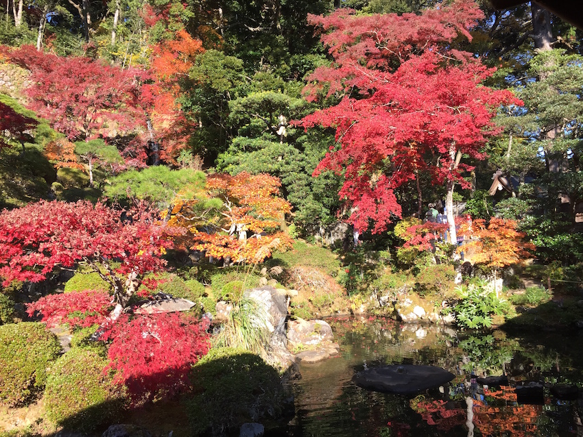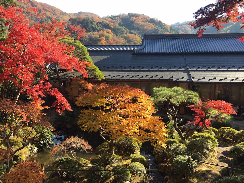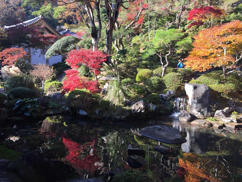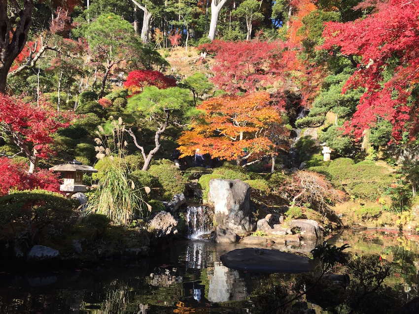 現在の庭園は明治時代に完成したもので、三島・楽寿園より小松宮彰仁親王の別邸を移築した折に築庭されたそう。皇太子時代の大正天皇が訪れた際に「東海第一園」と仰せになった池泉回遊式庭園。斜面からのぞめる紅葉で色づいた伊豆の山々も美しい!
