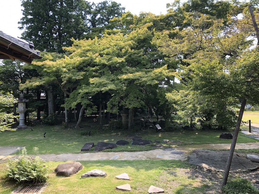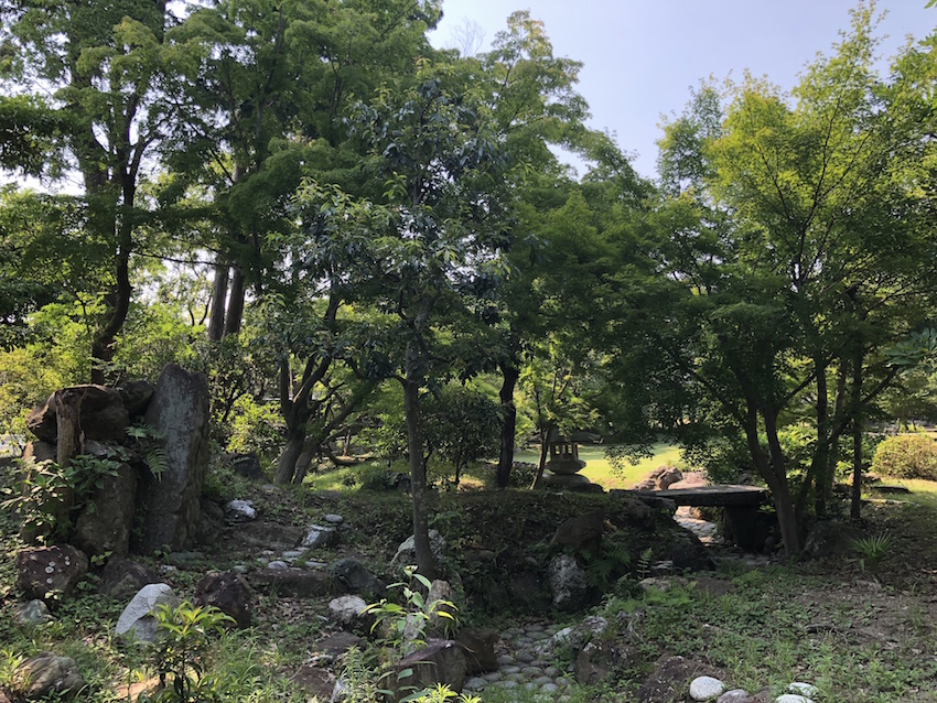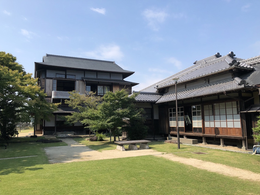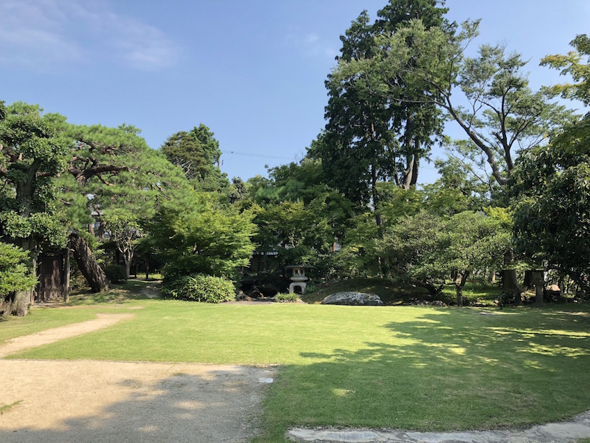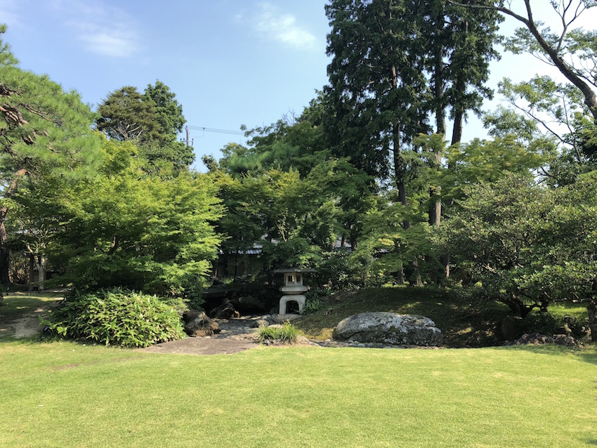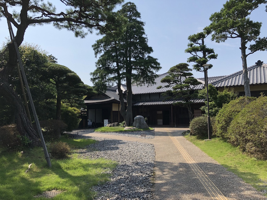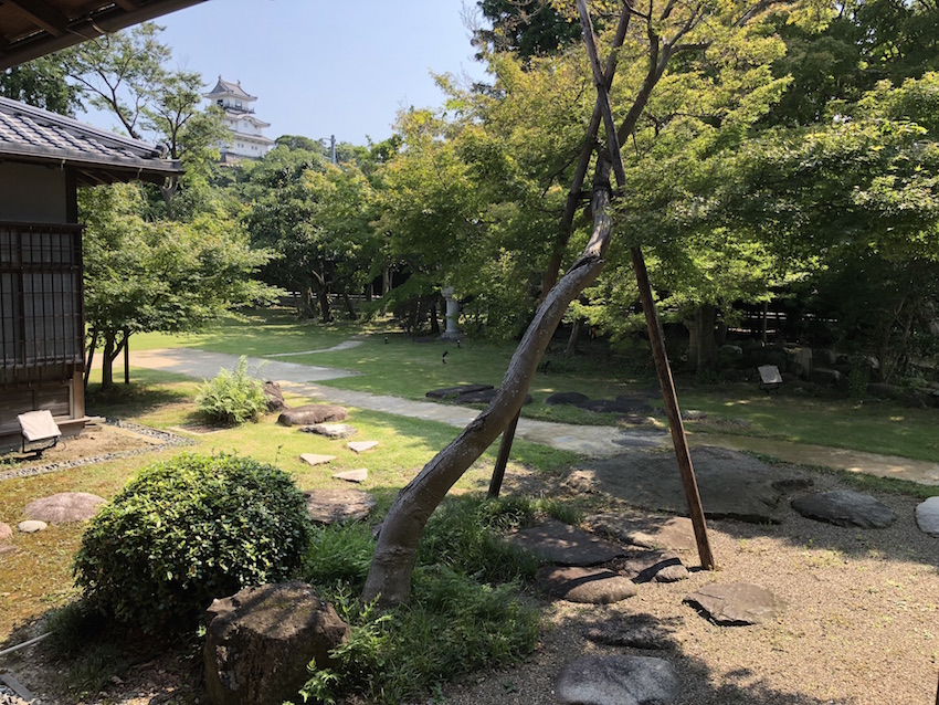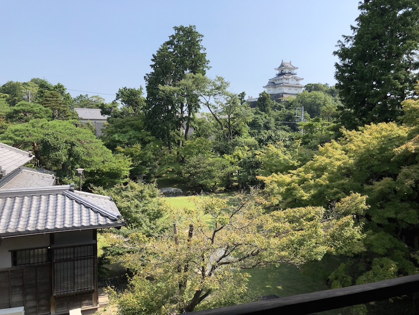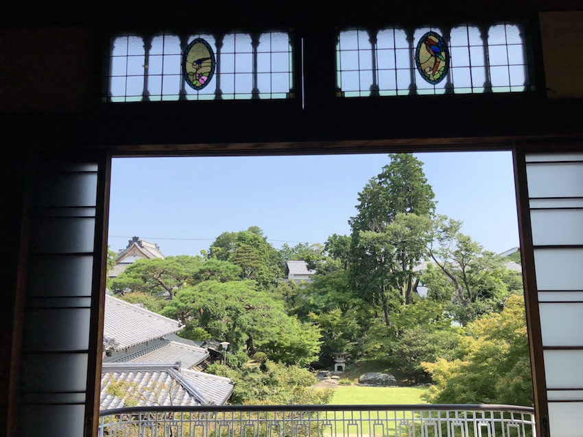 山内一豊が掛川城主になった際に掛川城が拡張され、その郭の一つが「竹の丸」とされます。そのため江戸時代には曲輪だった場所で、廃藩置県後に松本家が取得し、現在の建物と庭園を造営。2階からの庭園越しに掛川城天守閣というのが良い眺め。欄間に埋め込まれたステンドグラスも素敵。