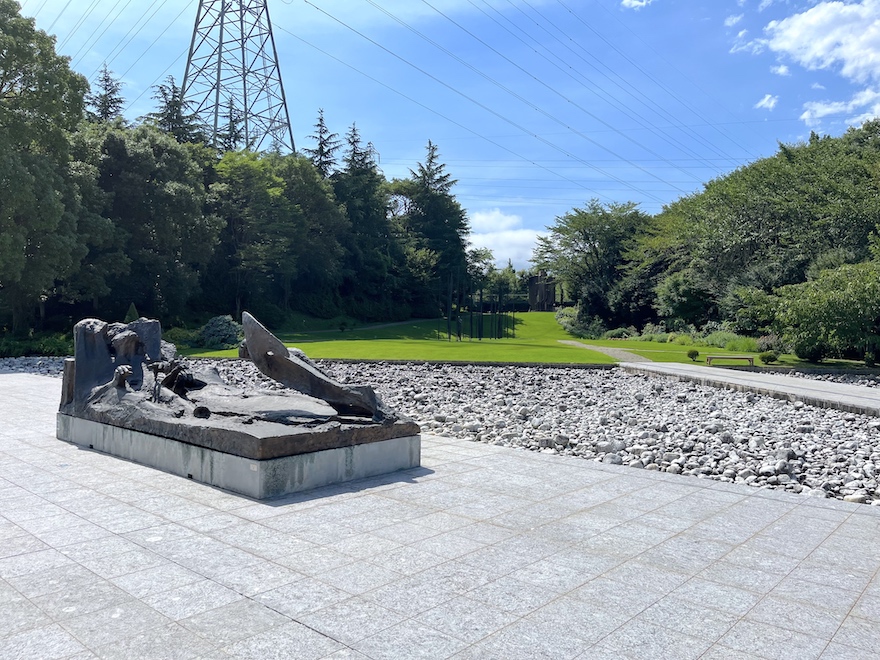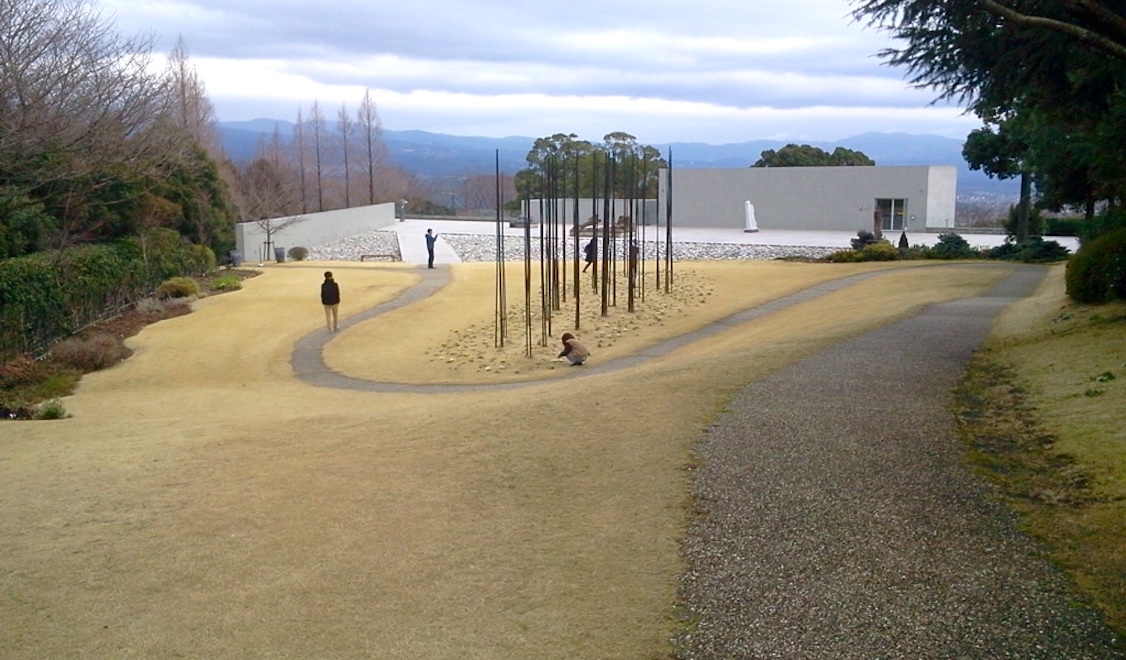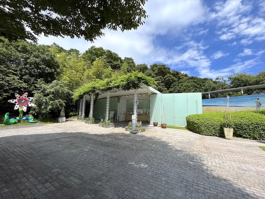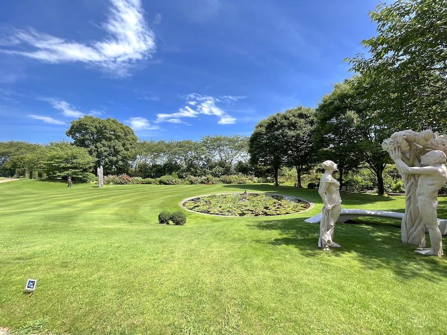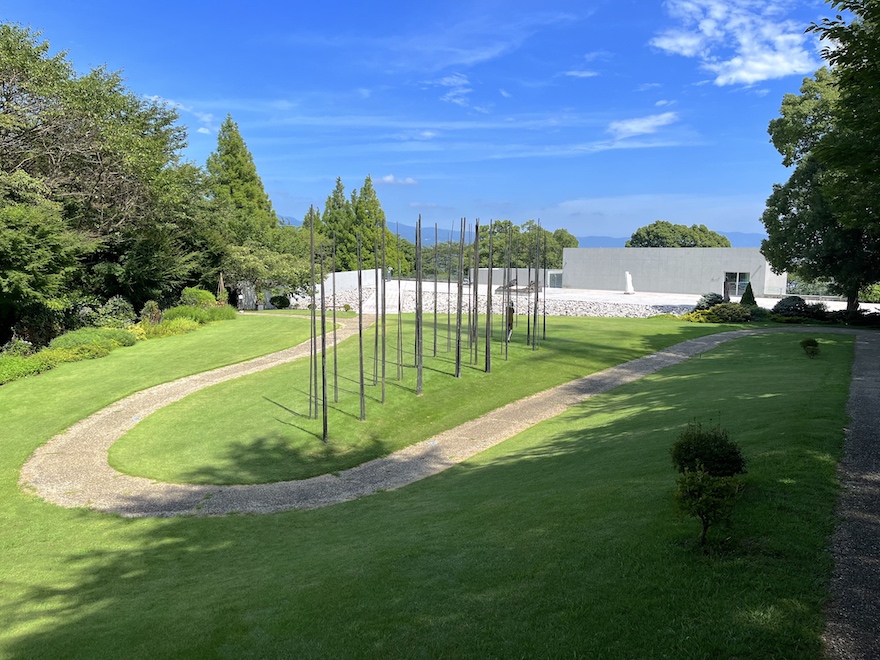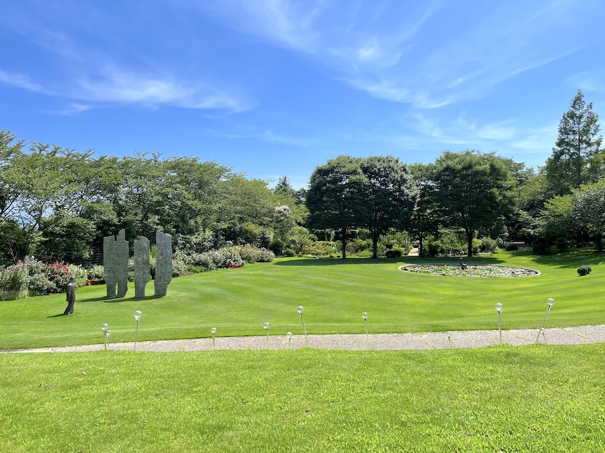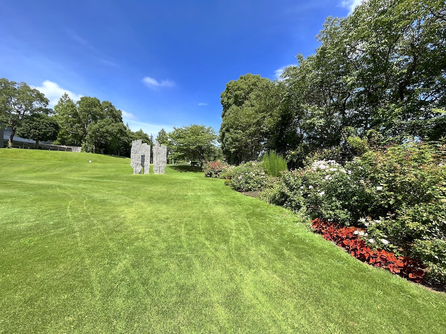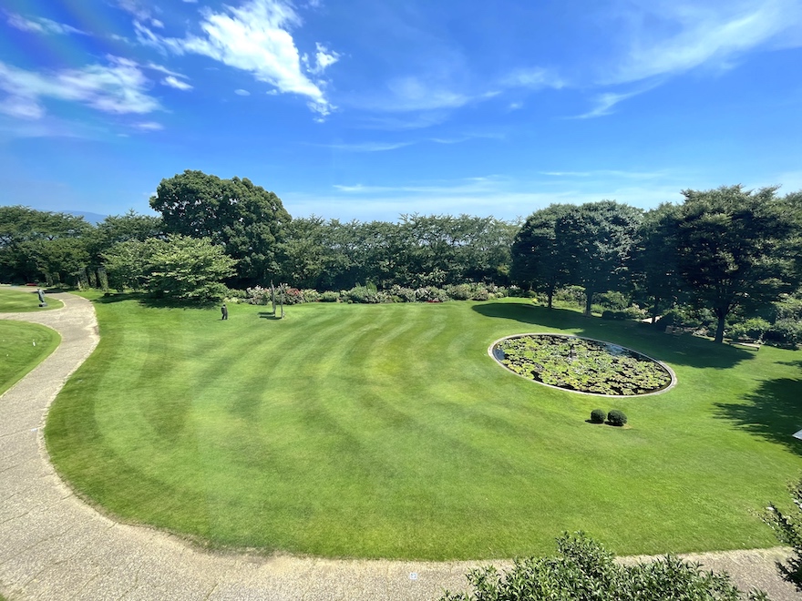 庭園はざっくり分けて2箇所。草間彌生さんの作品に迎えられるアプローチ〜展示デッキに至る“上部庭園”と、広い芝庭の中に“鏡池”“クレマチス ホワイトガーデン”“ローズガーデン”“くすの木の丘”からなる洋風の池泉回遊式庭園。上部庭園からは伊豆の山並みの借景も!(*以前「晴れたら富士山が借景に」とか書いてましたがそれは嘘でした…)
