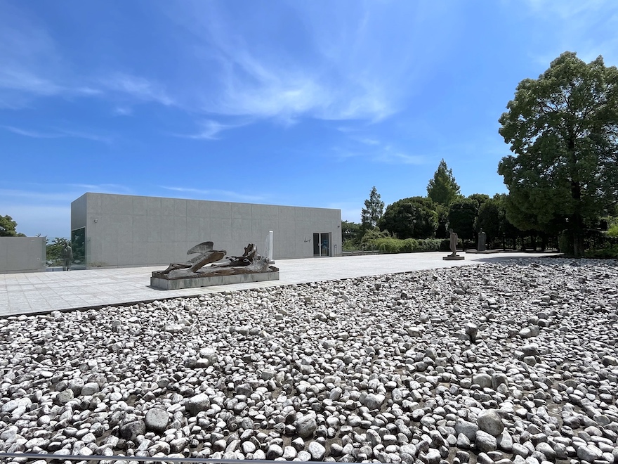 「ヴァンジ彫刻庭園美術館」はビュフェ美術館より約30年後の2002年4月に開館。地元イタリアやヨーロッパではピサ大聖堂、パドヴァ大聖堂、ナポリのサン・テルモ城、フィレンツェのベルヴェデーレ城塞…など教会・お城・宮殿でも作品を発表したヴァンジ。この美術館も氏の作品の展示に特化して設計されたもので、館内への入り口になる白い御影石が敷き詰められた展示デッキ&石庭は日本国内でもここしかない!と言える空間。