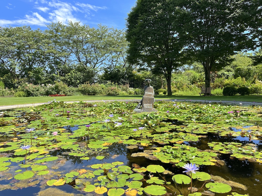 施設の名前にもなっている“クレマチス”の花は長泉町の特産物でもあり、クレマチスガーデン全体に約250品種2000株以上が植栽されています。またそのクレマチスと競演するよう植栽されたバラは90品種。そして今回訪れた夏場は“鏡池”の中で鮮やかな睡蓮の姿が!