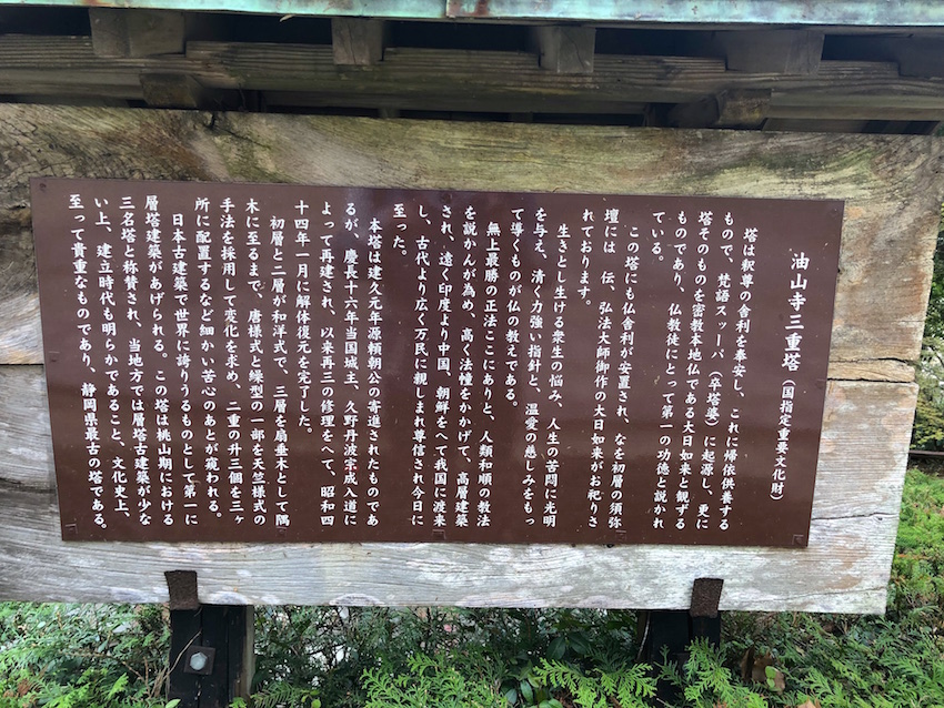 境内の最奥には“安土桃山期の三名塔”の一つとも称されている(らしい)国重文の三重塔と、かつて三重塔と共に源頼朝より寄進されたという薬師本堂があります。これは頼朝も油山寺で眼病治癒を祈願し、その後治ったから――とのこと。効果すごい。ちなみに薬師堂と三重塔の普請奉行を務めたのは“曾我兄弟の仇討ち”でも知られる工藤祐経(伊那の『深妙寺』に続いて連日の紹介)。